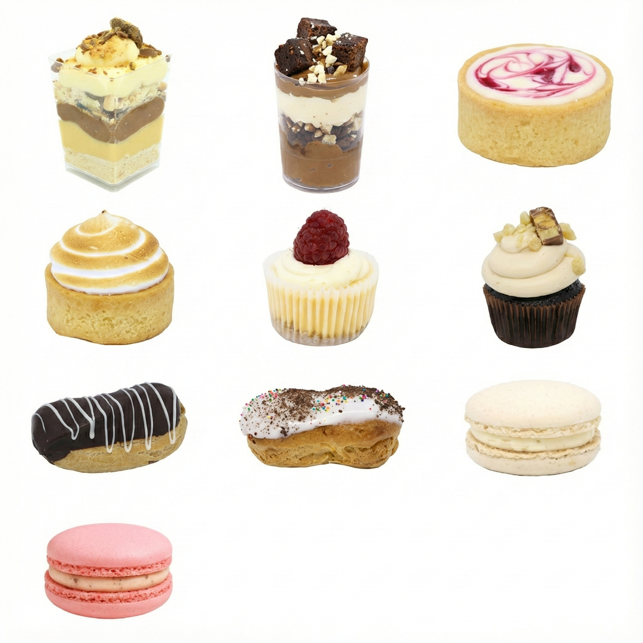 This pack includes ten varieties of our signature desserts, offering a complete mix of textures: Cups, Tarts, Cheesecakes, Eclairs, and Macarons. You will receive an equal quantity of each flavour listed below: